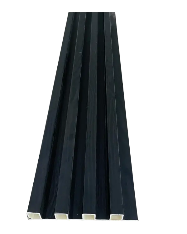 Modern WPC fluted wall panel in Black Wood finish, blending contemporary elegance with the durability and water-resistant properties of plastic — ideal for stylish interior walls and ceilings.